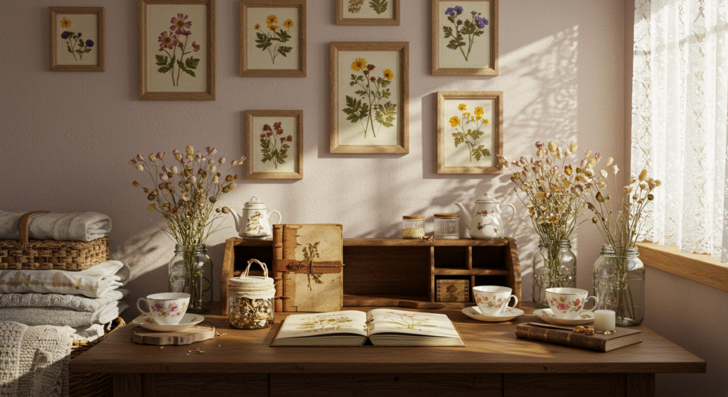 Pressed flowers bring the outdoors inside and add delicate, natural beauty to your walls. Create your own botanical treasures using blooms gathered during peaceful nature walks, or find affordable vintage style prints online. Arrange them in thrifted frames of various sizes to create a charming gallery wall that captures the essence of countryside living.